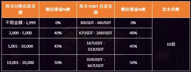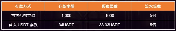 新會員首次存款前,可選擇使用 USDT 或台幣存款,系統將依照存款方式自動贈送對應優惠點數。