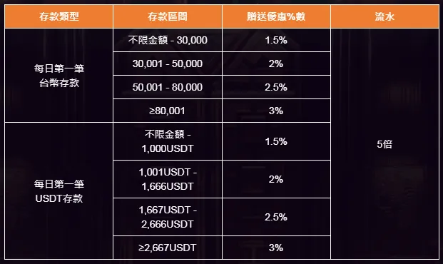 每日第一筆存款(00:00:01–23:59:59),存款前請選擇使用 USDT 或台幣方式,並勾選欲申請的優惠方案